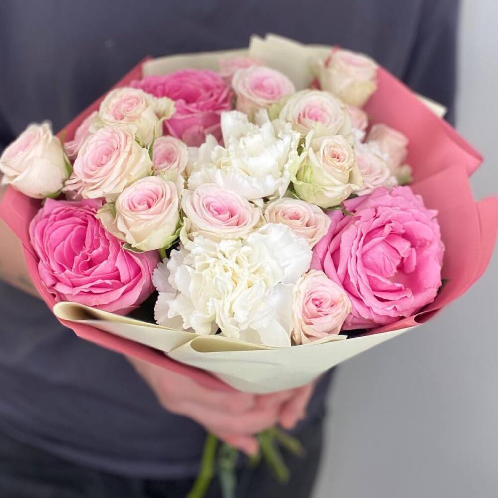 Гвоздики, Кустовые розы, Лизиантусы, Пионовидные розы, Розы