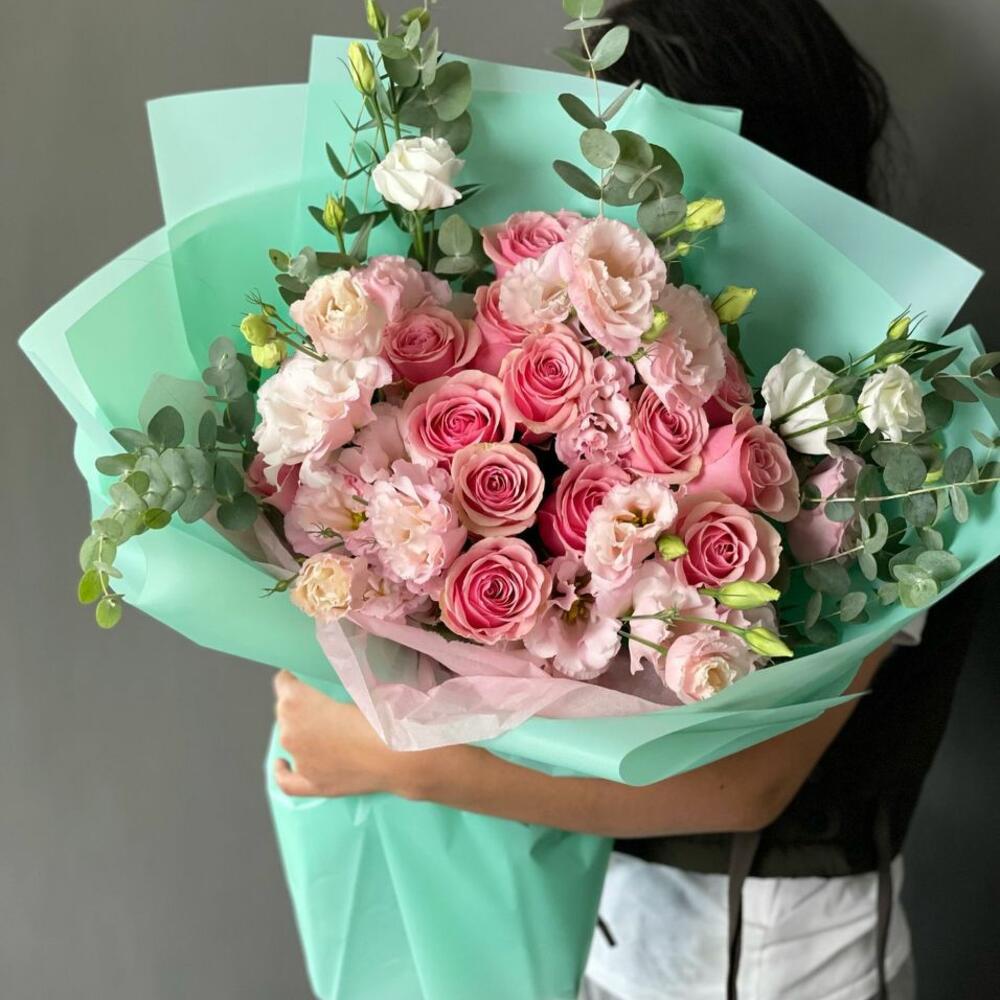 Гвоздики, Лизиантусы, Розы, Тюльпаны