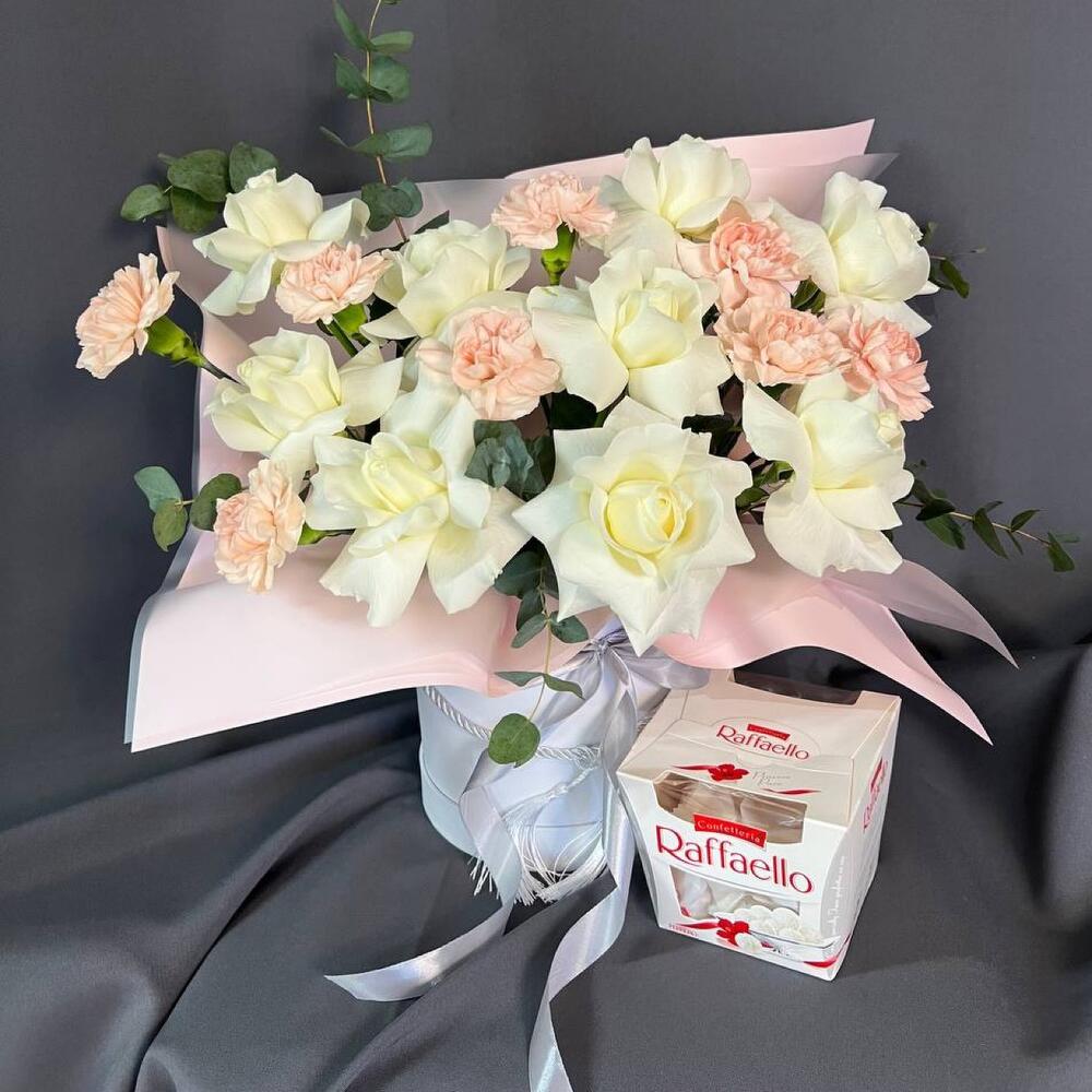 “Атлас☁️” – цветочная композиция с зефиром в деревянном ящике