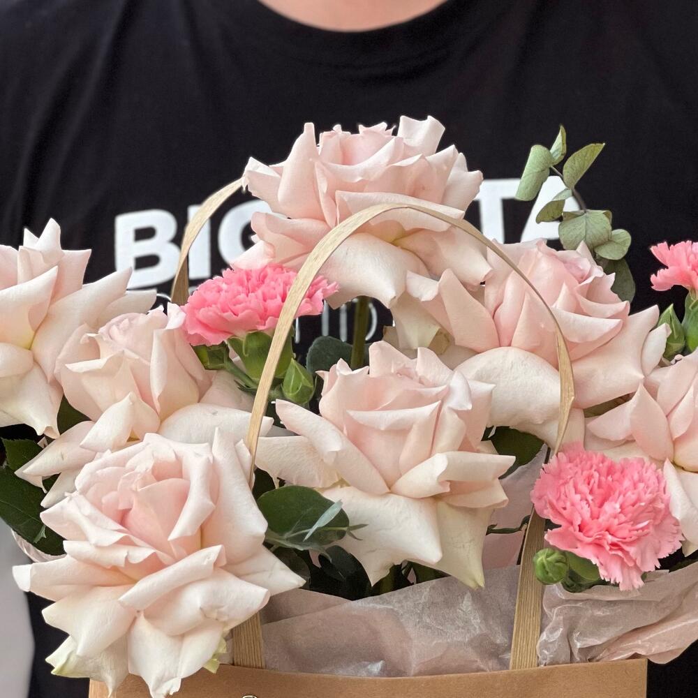 Евро-Букет из Роз,Диантусов и Эвкалипта + открытка ручной работы в подарок