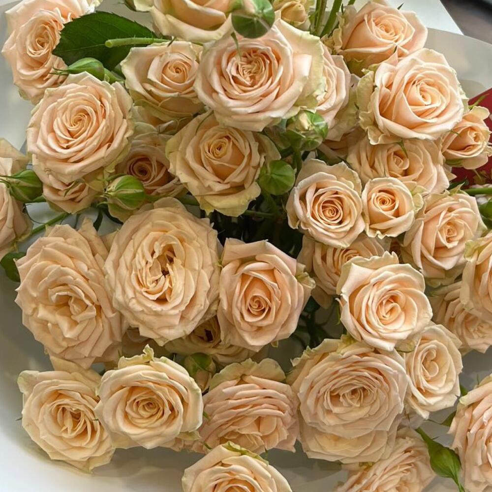 Кремовая кустовая роза – 13 шт. Открытка – 1 шт. Упаковка дизайнерская – 1 шт. инструкция по уходу за цветами – 1 шт.