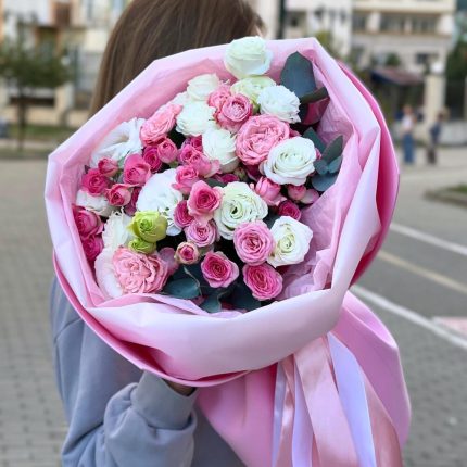 Альстромерии, Гвоздики, Кустовые розы, Лизиантусы, Розы, Хризантемы