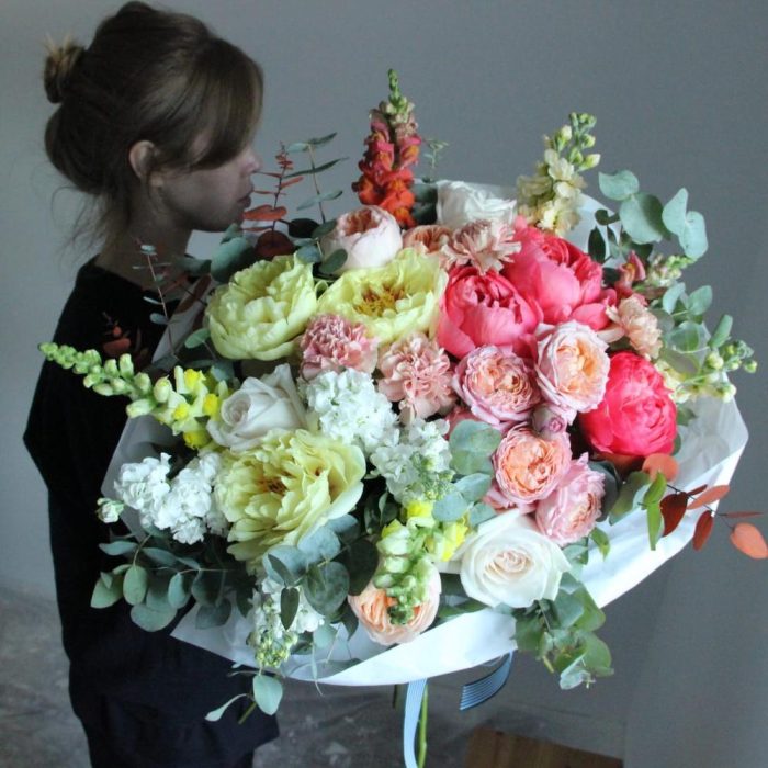 Пион Голландия – 6 шт.Львиный зев – 6 шт.Маттиола – 6 шт.Роза пионовидная – 7 шт.Роза пионовидная кустовая – 3 шт.Гвоздика – 5 шт.Эвкалипт – 9 шт.Бумага – 3 шт.Лента атласная – 2 шт.