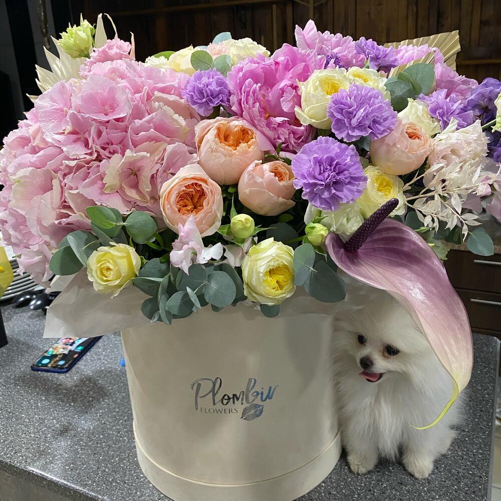 Гортензия – 1 шт.Коробка шляпная – 1 шт.Оазис флористический – 2 шт.Пион – 3 шт.Роза – 5 шт.Роза кустовая – 5 шт.Эустома – 5 шт.Зелень – 5 шт.Сухоцветы – 5 шт.