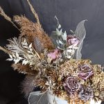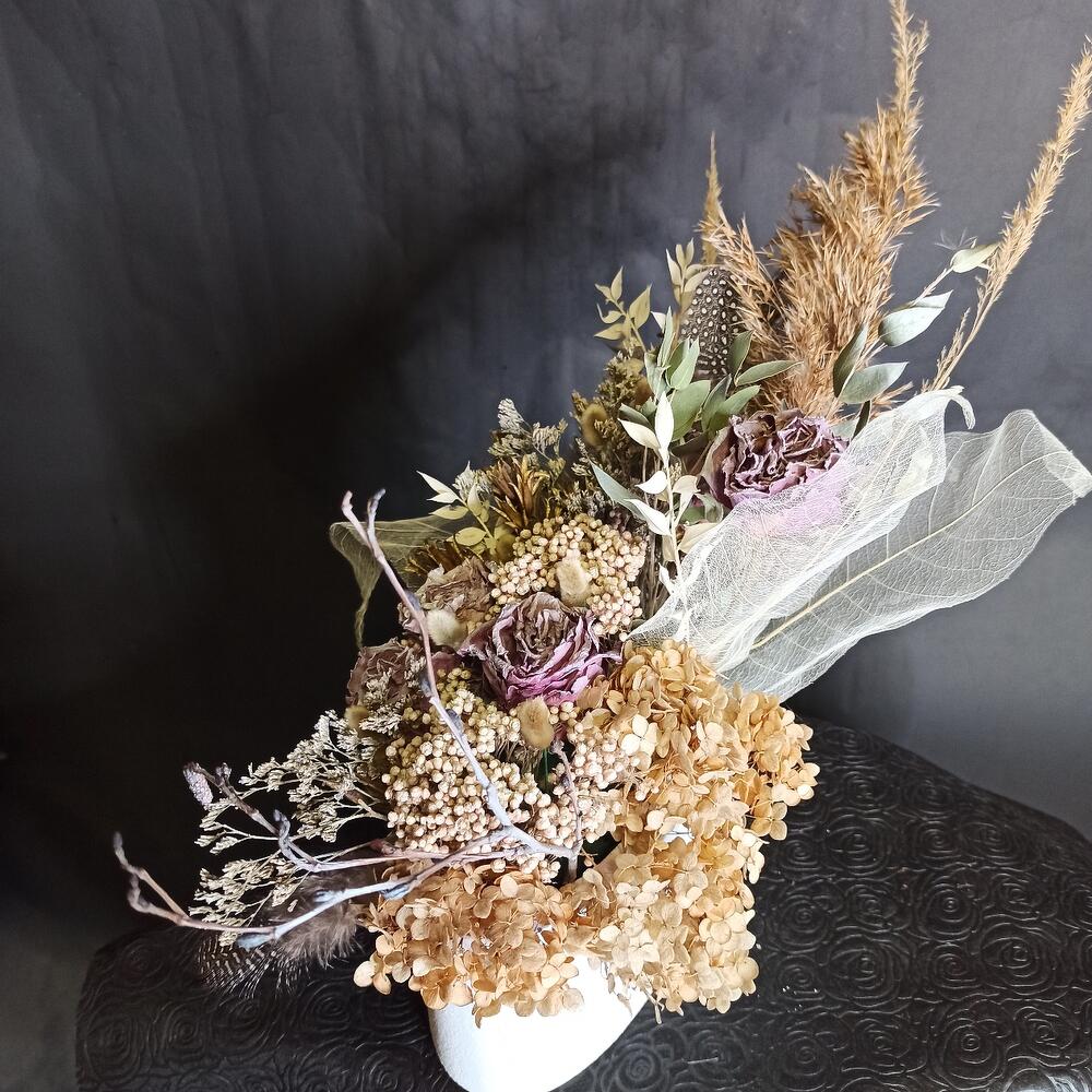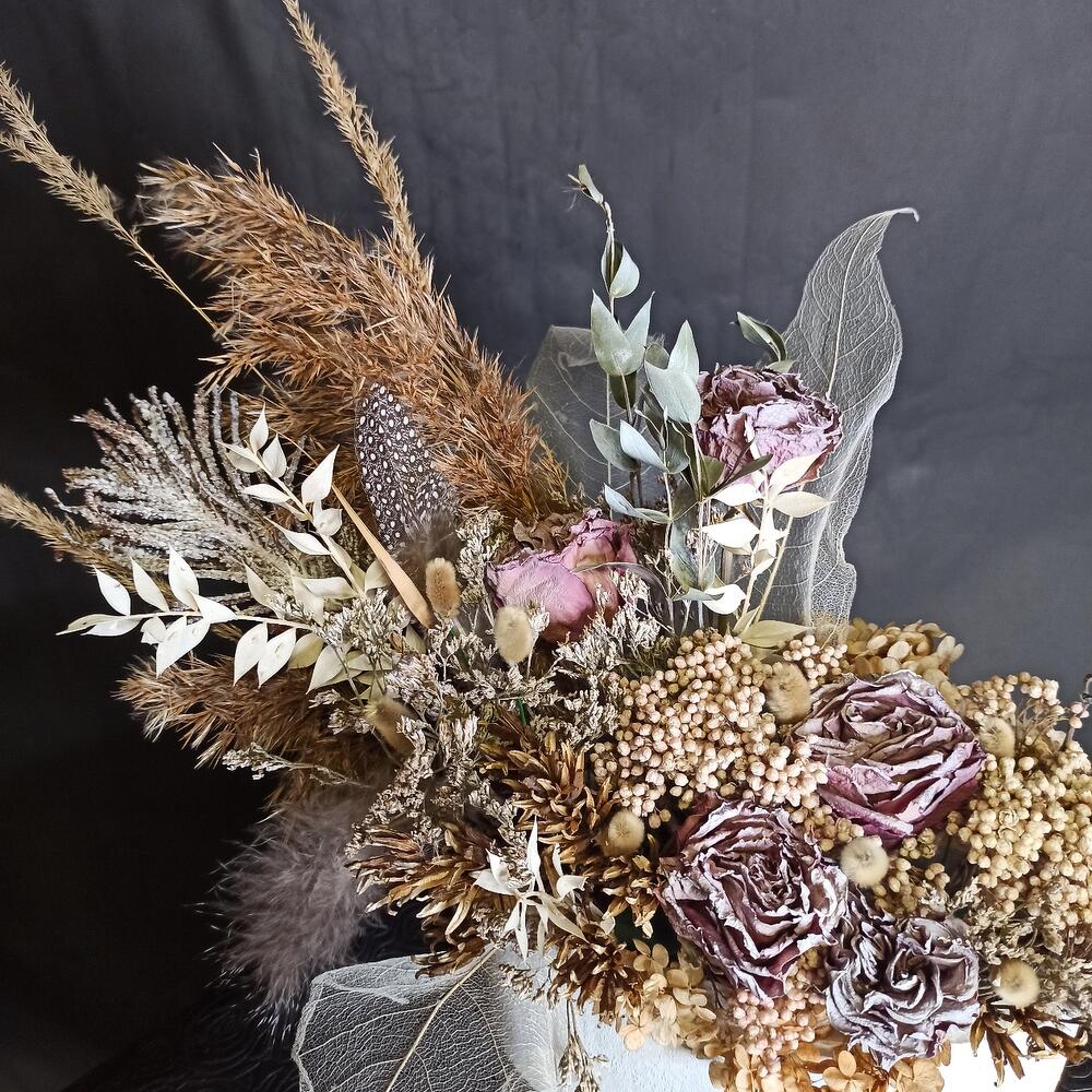 Кашпо – 1 шт.Кенийская роза – 5 шт.озонтамус – 2 шт.Лимониум – 1 шт.иглица крашенная – 3 шт.пампасная трава – 3 шт.перья – 3 шт.Эвкалипт – 2 шт.Папоротник – 1 шт.