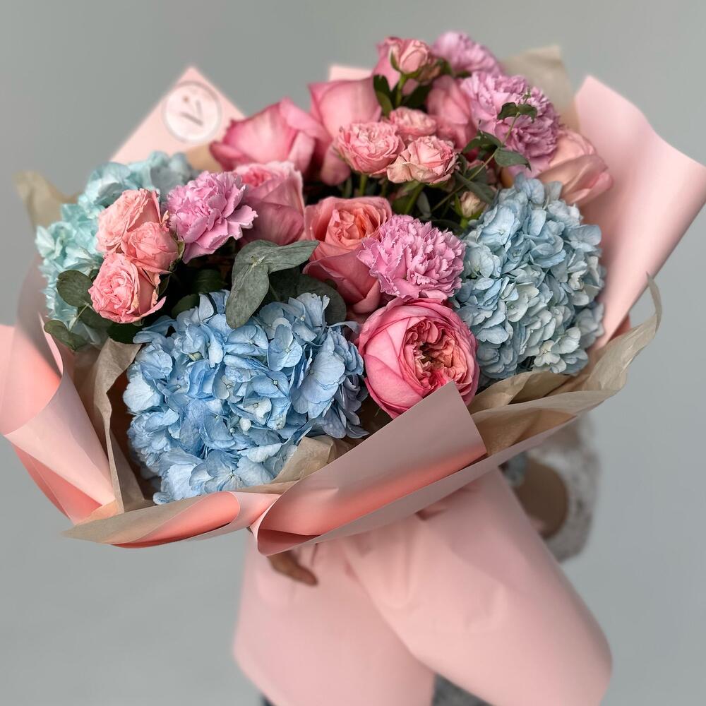 Альстромерии, Гвоздики, Кустовые розы, Лизиантусы, Розы, Хризантемы