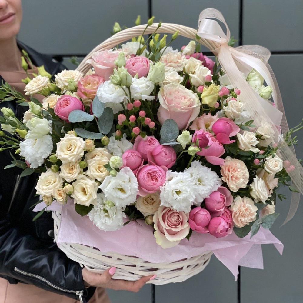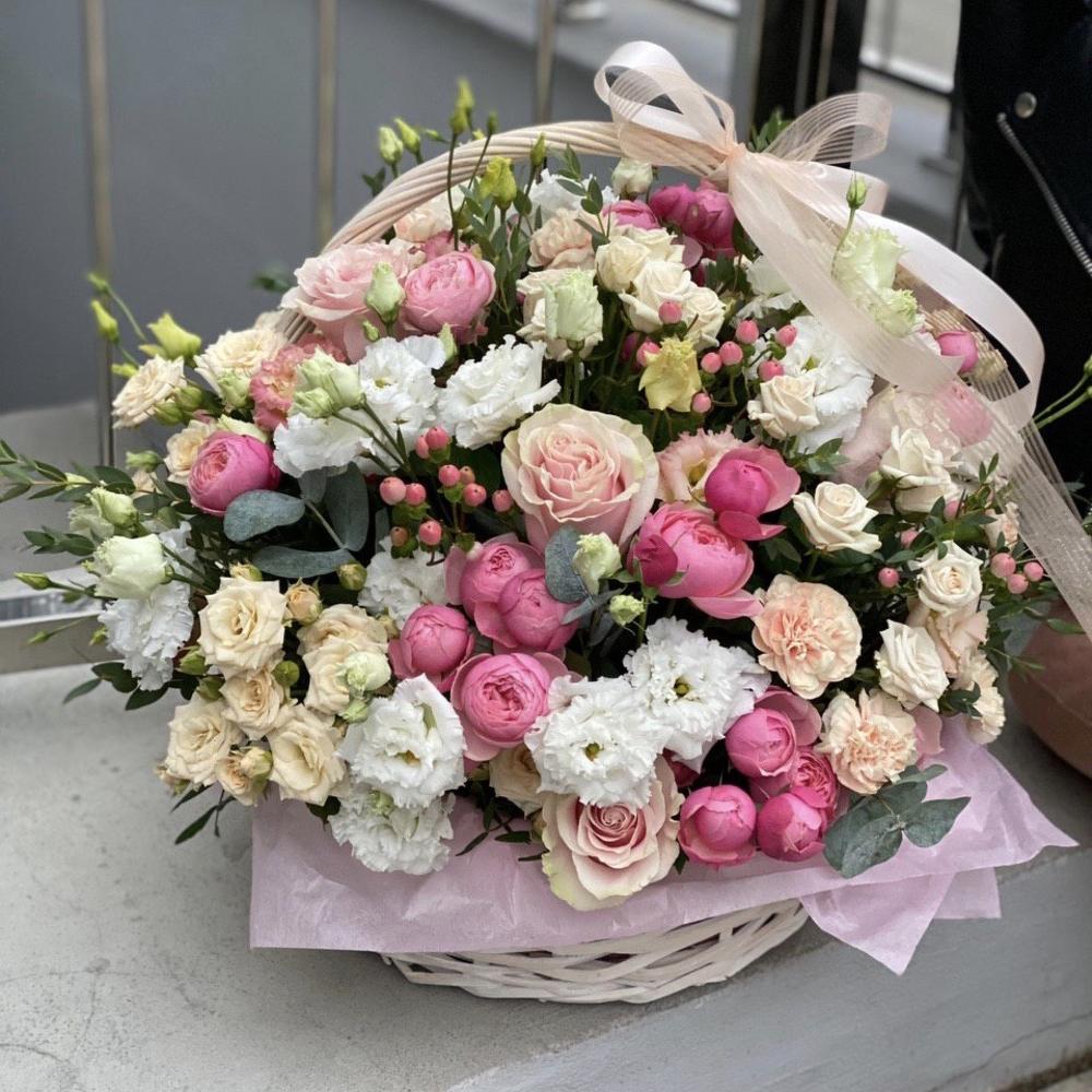 Эустома – 10 шт. роза розовая пинк мондиаль – 9 шт. Эвкалипт – 3 шт. Гиперикум – 5 шт. Гвоздика – 7 шт. кустовая роза таня – 5 шт. кустовая роза роял порцелина – 5 шт. кустовая пионовидная роза сильвия пинк – 8 шт. Корзина – 1 шт. Оазис – 6 шт. Оформление – 1 шт.