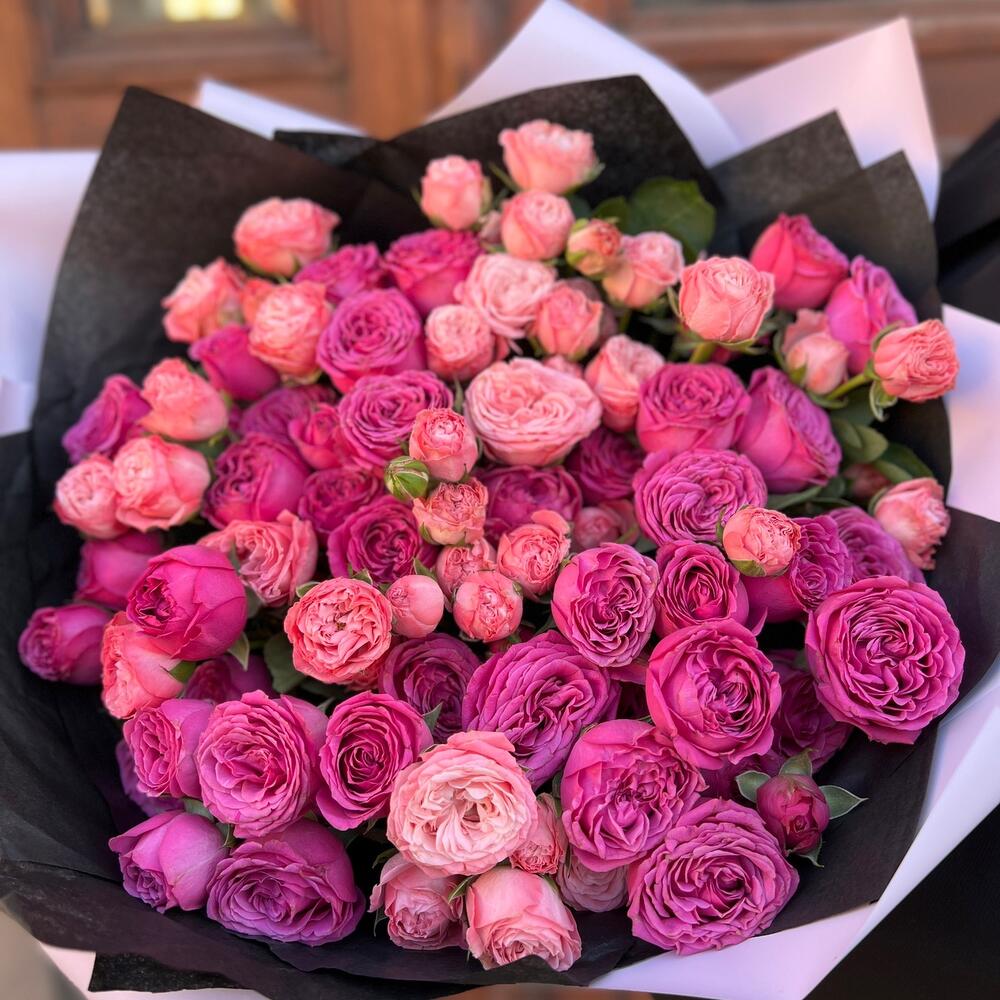 Лента атласная – 2 шт.Тишью – 2 шт.Пионовидная кустовая роза – 21 шт.Пленка матовая – 2 шт.