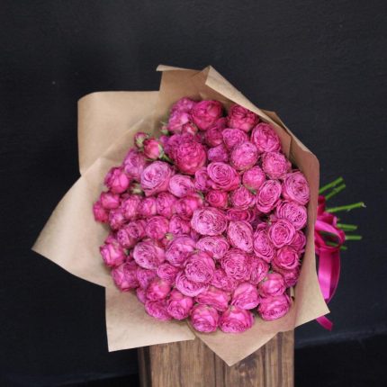 Эвкалипт – 1 шт.Лента атласная – 1 шт.Упаковка дизайнерская – 1 шт.Пионовидная кустовая роза – 5 шт.