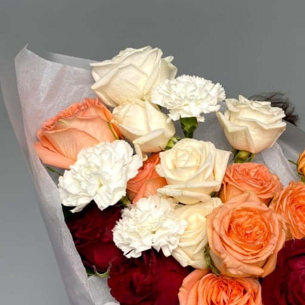 Альстромерии, Гвоздики, Кустовые розы, Лизиантусы, Розы, Хризантемы