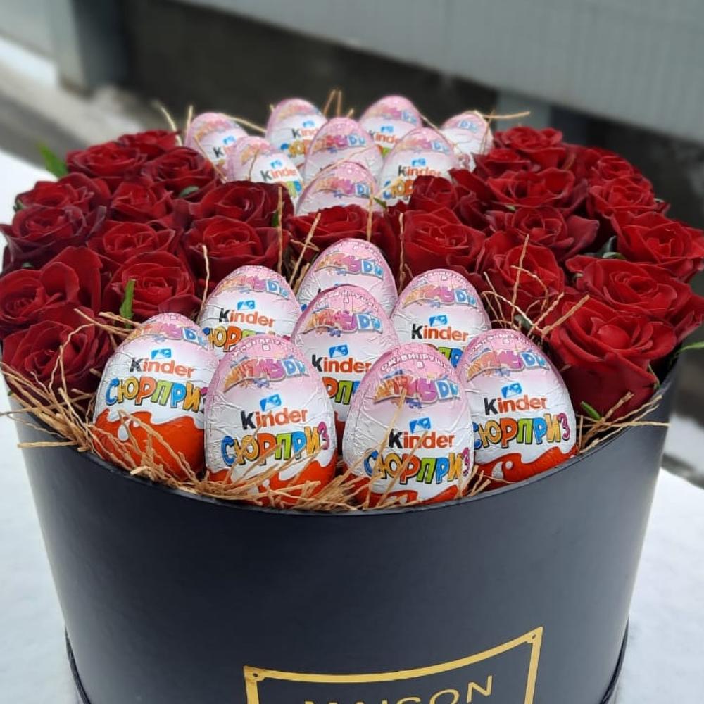 Подарочный набор из красных роз и киндер сюрпризов в фирменной коробке.