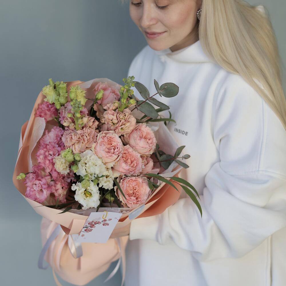 Маттиола – 2 шт. Лента атласная – 2 шт. Упаковка дизайнерская – 1 шт. эустома розовая махровая – 2 шт. Эустома белая махровая – 1 шт. Карточка для подписи – 1 шт. джульетта роза пионовидная – 1 шт. зелень эвкалипта – 2 шт.
