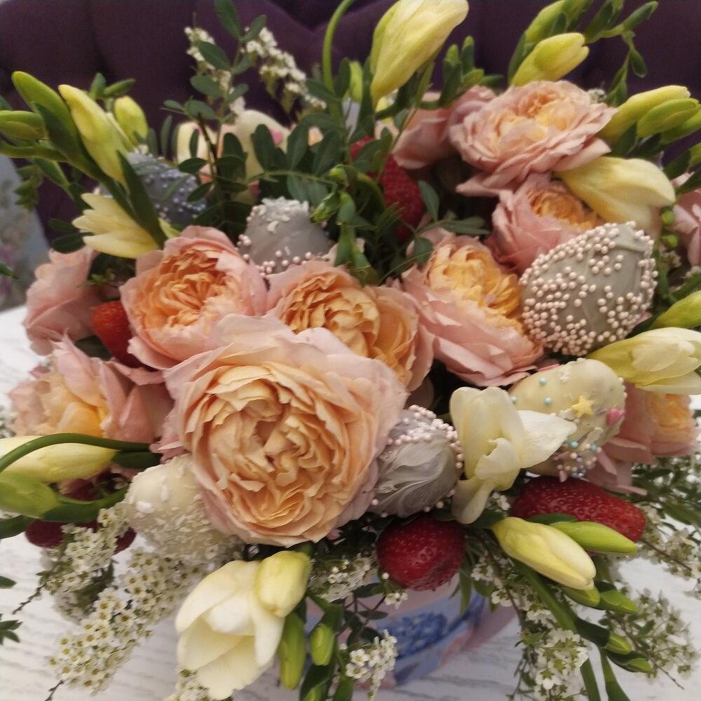 Клубника – 15 шт.Фрезия – 10 шт.Кустовая роза – 5 шт.Коробка шляпная – 1 шт.Фисташка – 5 шт.Клубника в шоколаде – 15 шт.Дизайнерская упаковка – 1 шт.