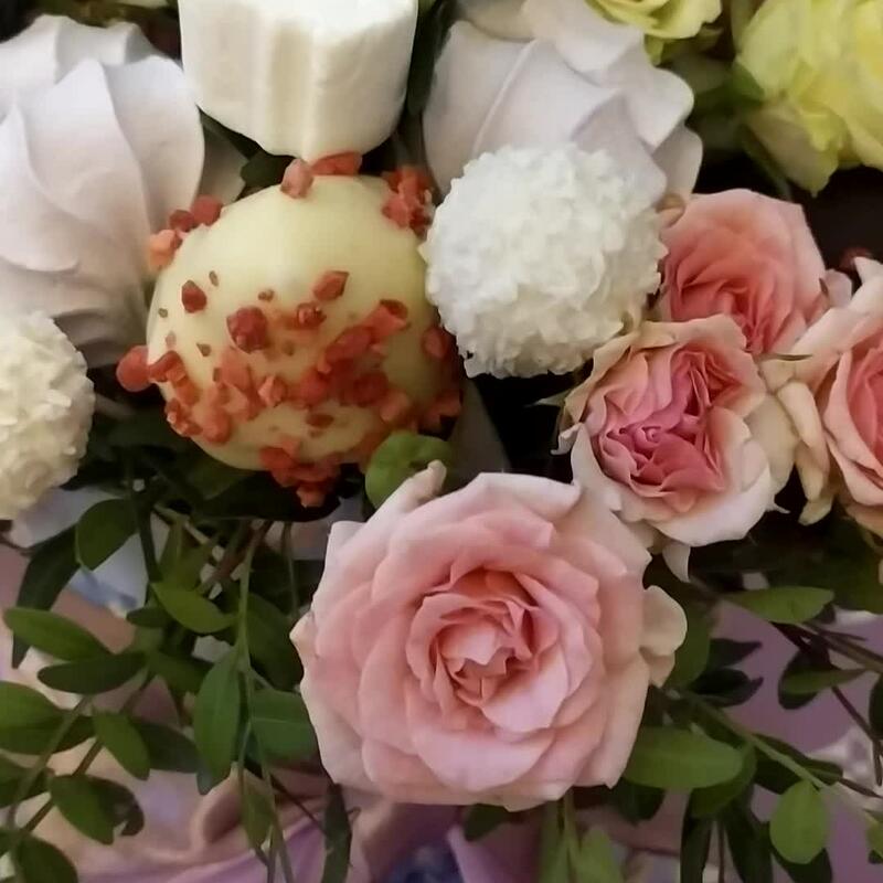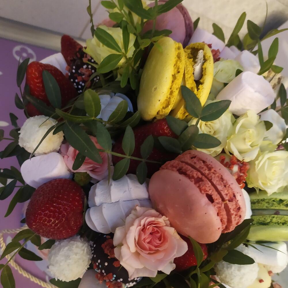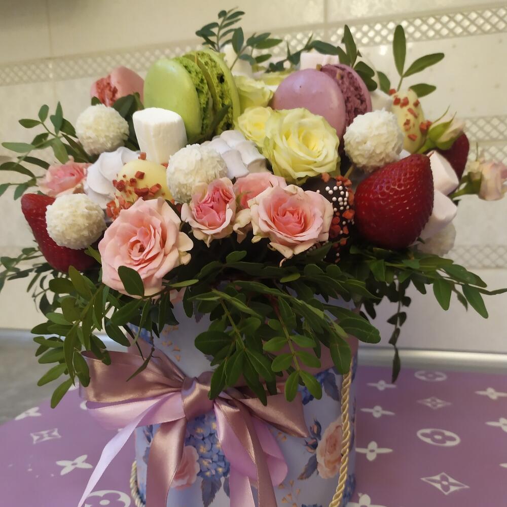 Клубника – 250 гр.Кустовая роза – 5 шт.Раффаэлло – 80 гр.Фисташка – 5 шт.Шляпная коробка с лентами – 1 шт.Фисташка пучок – 5 шт.Зефир ванильный – 5 шт.Клубника в шоколаде – 200 гр.Дизайнерская упаковка – 1 шт.маккаруни – 5 шт.мешмеллоу – 50 гр.