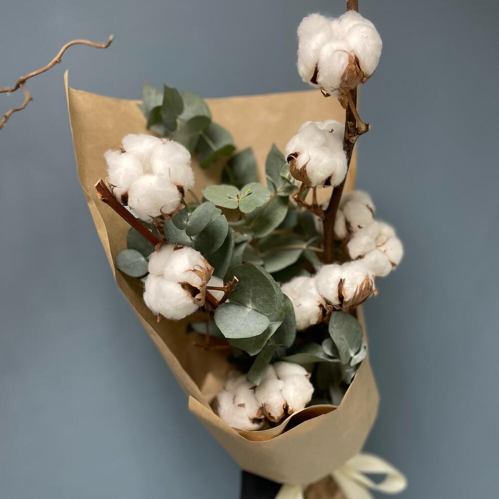 Хлопок (сухоцвет) – 2 шт.Эвкалипт – 4 шт.Упаковка дизайнерская – 1 шт.