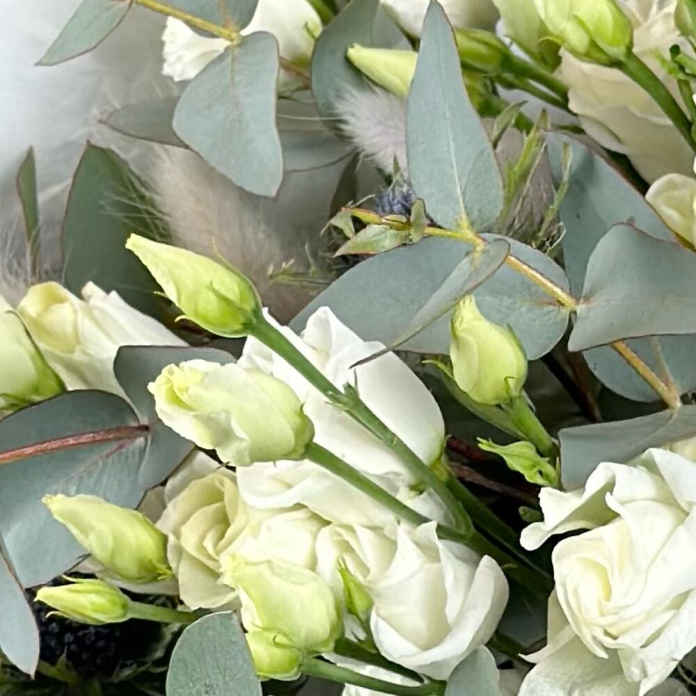 Эрингиум – 3 шт.Лента атласная – 1 шт.Лагурус – 15 шт.Дизайнерская упаковка – 2 шт.эустома ду росита белая – 7 шт.