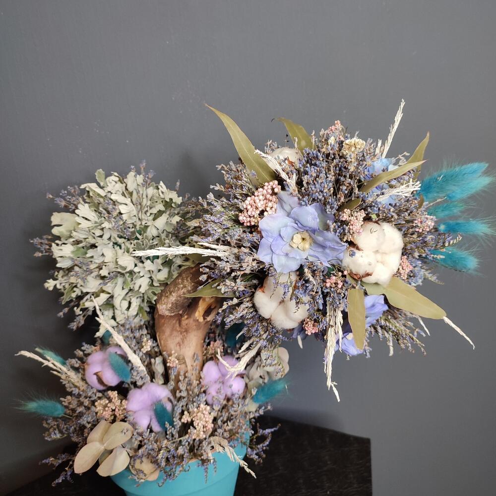 Кашпо керамическое – 1 шт.Оазис флористический – 3 шт.Лаванда (сухоцвет) – 3 шт.Хлопок натуральный – 8 шт.Лагурус (сухоцвет) – 13 шт.Озотамнус – 1 шт.Эвкалипт – 1 шт.цветы искусственные – 7 шт.