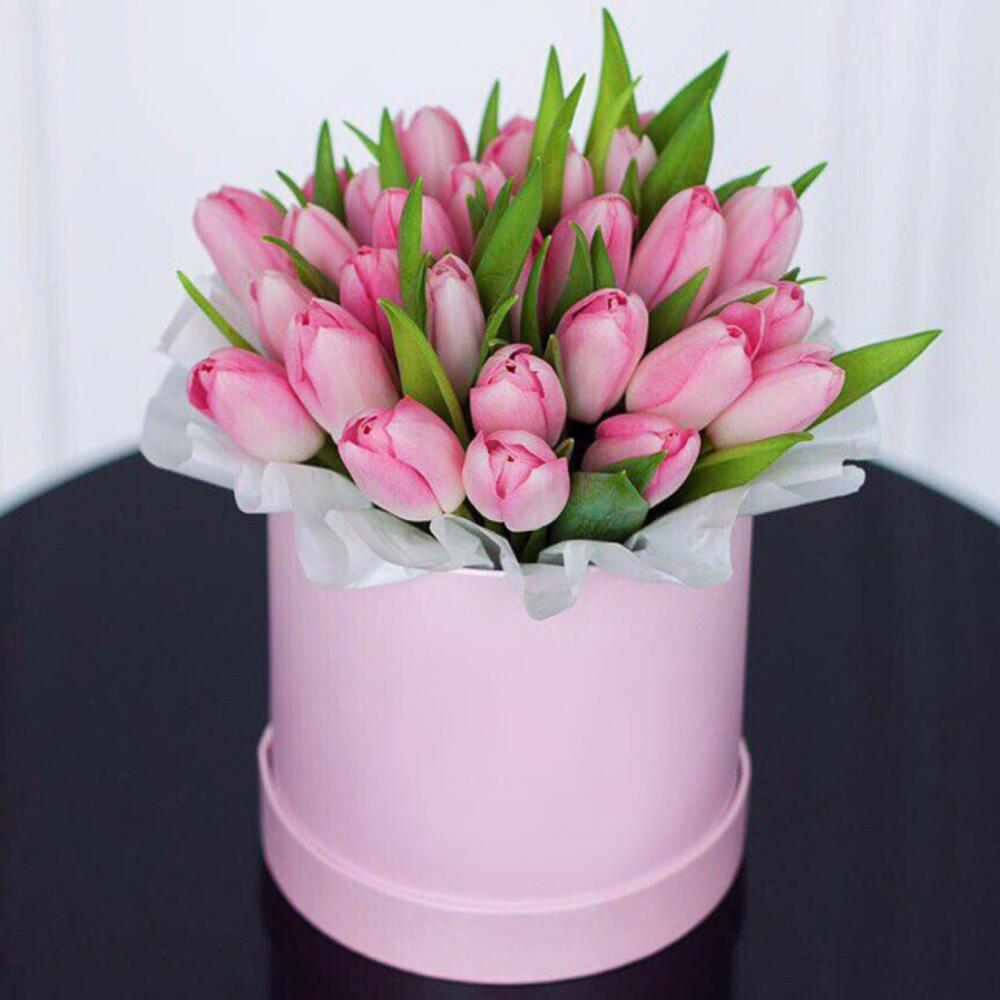 Нежно розовый тюльпаны в шляпной коробке , идеальное решение для подарка . Ваза больше не нужна . Тюльпаны подпитываются от флористической губки и стоят очень долго . )